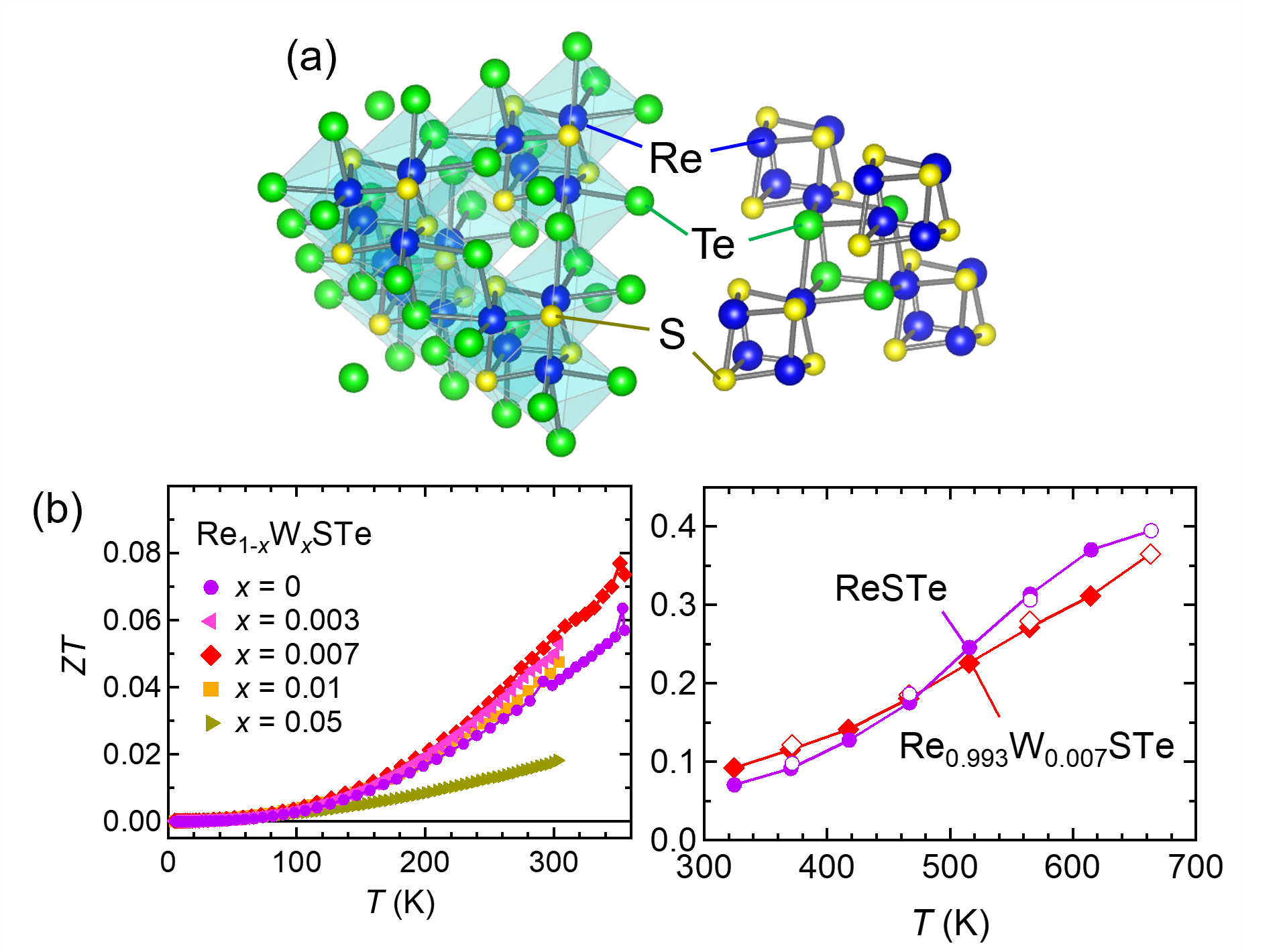 Figure 1. (a) Crystal structure of ReSTe. (b) Temperature dependences of the dimensionless figure of merit ZT. (a) ZT of the sintered Re1−xWxSTe samples below 350 K. (b) ZT of the sintered ReSTe and Re0.993W0.007STe samples above room temperature.